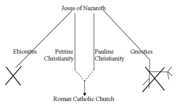 A prevalent idea in current religious studies is that Christianity as we know it became associated by way of historical process with the Roman government. The line of descent from Jesus that history preserved was that line of development, both as to its viewpoints and its literature. Petrine Christianity as represented by the Judaizers was the main contrast to Pauline Christianity and its international universalism. Government influence suppressed and destroyed the writings of “heretics” as measured by the preserved standard, and generally disenfranchised its people. So, the understanding of Jesus as well as the canonical literature that has descended to us results from historical processes and no more represent a “legitimate,” or true, understanding of Jesus than other traditions did.