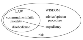 Wisdom literature has some affinities with law. They both deal with human behavior and so use the imperative mood extensively. Wisdom, however, is a larger category than law even as advice is larger than commandment. The accompanying diagram shows their relationship. Advice vs. commandment, opinion vs. faith and fact, procedure vs. fundamental morality represent distinctions between the two types of material. Advice and commandment differ as to intent and scope. The advice in wisdom literature is not interested just in what