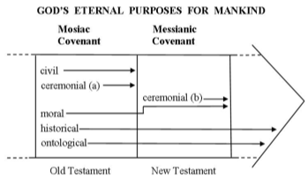 The broad arrow given earlier represents the flow of holy history. The left part pictures God’s will for his people during the Mosaic age. At that time, Israel was the people of God in a national sense. The right part of the arrow stands for God’s will during the Christian age, “spiritual Israel” in an interpersonal sense. At this time, the church is the people of God. In the shift from the previous “dispensation” to the present, many things do not change, some things drop out altogether, a few things are adjusted, and some things are added.