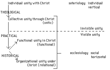 In the question of organizational church unity, the proper antitheses are not (1) organizational unity vs. functional unity (Catholicism vs. Emil Brunner’s concept), or (2) visible unity vs. invisible unity (Catholicism vs. denominationalism), but (3) hierarchical unity vs. non-hierarchical unity. It is a question of the form of organizational unity per se.