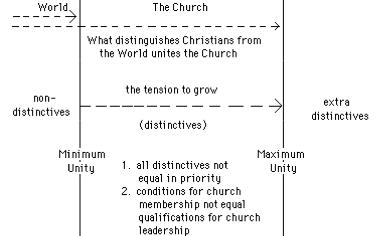 The formal approach to the visible unity of the church may be expressed in one general principle: “What distinguishes Christians form the world is what unites them together.” What takes individuals out of the world in the first place becomes the minimum basis for uniting them together in the church. Everything that distinguishes Christians from the world becomes the maximum requirement for uniting them together.