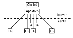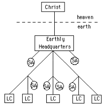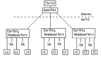The following schematic shows the relationship of Christ, the Apostles, Local Congregations, and Service Agencies in an organizational pattern that has no earthly headquarters.