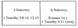 From Romans 16:1; 1 Timothy 3:11; 5:3-16, some exegetes have concluded that there were “deaconesses” were in the early church.37 The group could have included the widows the church supported, and this service could have been their way of “repaying” the church for their support in return. As respects the larger question about the New Testament pattern for church unity, we need not solve this question. If 1 Timothy 3:11 speaks of deaconesses under the word γυναῖκες, mentioning them amid statements about deacons makes them not so much a separate function as a part of the same function: “service” to the local Christian community. Certain services to female members could with more propriety be fulfilled by women or by husbands (διάκονοι, diakonoi) and wives (γυναῖκες, gynaikes) together. The relationship between deacon and deaconess could be as follows:38