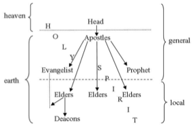 At the local level, prophet differed from elder by being non-authoritative and from deacon by being extraordinary (though a deacon might have the gift of prophecy).36 Likewise, at the general level, prophet differed from apostle by being non-authoritative and from evangelist by being extraordinary. Authoritative vs. non-authoritative, ordinary vs. extraordinary, and general vs. local are the three pairs of variables by which positions in the church find definition.