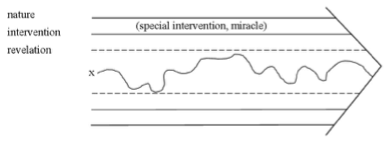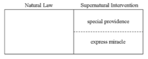 (3) The outermost lines represent in-built limitation that determines the range of variation. (4) Within natural law appears divine intervention, which can take two forms—special providence and express miracle. Miracle differs from special providence by its evidential value. Miracle involves visible intervention; special providence may include invisible intervention. They are equally supernatural, but they differ on how obvious that supernaturalness is. Generally, answered prayer corresponds with special providence because the point of prayer is benefit; the added point in miracle is evidence.