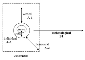 The second primary framework is that ethics and morality have to do with person-to-person associations. Person-to-thing and thing-to-thing relationships do not involve right and wrong in a moral sense. The diagram below pictures a second primary framework, which deals with the operation of what God purposefully created. It organizes the basic dimensions of life in terms of personal factors. Life has two primary aspects often called the “existential” and the “eschatological.” “Existential” refers to the present experience of “existence,” including relationships vertically with God (A-1), horizontally with other people (A-2), and internally between the inner and outer aspects of a person—spirit and flesh (A-3). “Eschatological” refers to the forward movement of life from purposes toward goals; it represents not just movement, but directional movement.1 Primary ethical principles correlate with aspects of these two main facets of living.