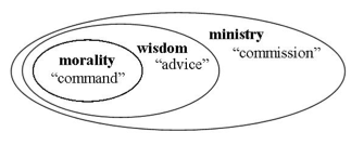 Morality includes not only what is or is not wrong, but what is wise. Wisdom brings in practical considerations. Some things may not break any of God’s abiding principles of behavior, but it is normally not wise to put ourselves in certain situations. What is possible is not necessarily smart, because we may not be as strong as we think we are; standing outside the force field of certain situations, we may suppose that we can handle more than we can. Not only does wisdom deal with us (which applies also in the “one-many splice” under A-3); it deals with practical effects on other people. It addresses what other people prefer, what other people may misread about our motives, and what other people may slip into doing on the basis of their misreading. Not only is there commandment; there is advice. And where there is neither commandment nor advice, love and expediency reign.