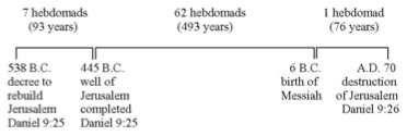 I. The most basic matter is the necessity of understanding seventy hebdomads figuratively, or symbolically, in a passage that is ostensibly rather literal otherwise. שָּׁבֻעִים is commonly interpreted to mean seventy weeks of “days,” which stand for “years.” As a result, a period of 490 years would be meant, an insufficient number to cover the 607 years from 538 B.C. to A.D. 70. If we begin with 458 B.C. with Cyrus’ decree, an interesting arrangement can be made in which the end of the sixty-ninth week is A.D. 26, the time of the Anointed One’s anointing with the Holy Spirit (cp. Acts 10:38) so that his being cut off is in the midst of the seventieth week (A.D. 30).