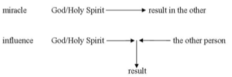 In miracle, conditionality is the only role that we have. We may ask for the effect, but the effect itself comes from God alone. In influence there is more than request, because the person’s response joins with influence to produce the result.