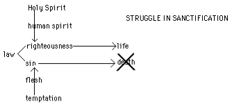Besides the law-flesh-death cluster of terms, there is a cluster of spirit expressions: spirit of the law, human “spirit,” Holy Spirit. That set of phrases raises two questions: (a) does spirit means human spirit or Holy Spirit and (b) what is meant by spirit of the Law vs. “letter of the Law”? To the first question we may say that our spirit and God’s Spirit correlate in contrast to flesh and Satan (sin, tempter). In unclear cases, we need not decide which is meant. It seems most natural, though, to take spirit in the lower case when it contrasts to flesh, and in the higher case when it contrasts with mankind. Flesh is one aspect of us; so we expect what it contrasts with another aspect of us—our spirit rather than the Holy Spirit.12 The hermeneutical “law of contrast” implies that contrasted items are at the same level within a common larger category. Since “flesh” is within the category “individual man,” we expect “spirit” to be within the same larger category “individual man.”