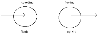 Since it is used actively, “flesh” stands by metonymy for its desires. Flesh is the noun equivalent for the verb in the prohibition, “Do not covet.” Coveting is self-centered behavior that correlates formally with the desiring of the flesh. Thirst is quenched by taking something into the flesh from the outside. The same is true of the other bodily drives. The flesh finds satisfaction only when something is directed in toward it, as distinguished from finding fulfillment by directing itself outward toward something else. Satisfying the flesh has an outside-to-inside pattern, the same pattern that coveting has.