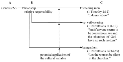 The accompanying diagram maps out the argument pattern. The main point lies in distinguishing (B) relative responsibility/headship from manifesting it in (C) teaching men. For comparison, we have pictured a parallel with 1 Corinthians 11, which deals with an issue more obviously conditioned by cultural considerations. In 1 Timothy, Paul does not have to be using Genesis as a basis for both steps. Genesis 2-3 may establish a historical basis for relative headship because the sequence and manner of creating woman manifests God’s intentions for man-woman association (Genesis 2 more clearly speaks in relational terms) and because the manner and sequence of the fall manifests something about their propensities (men too susceptible to female influence and women too susceptible to a sense of limitation?).