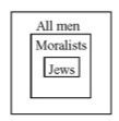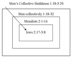 Another observation that supports the suggested arrangement of thought is the blurring of categories between pagans, moralists, and Jews. Under an inductive pattern we would not expect such a phenomenon, but it fits with a pattern of narrowing categories. (a) While talking about all people (large square), a presenter may mention something peculiar to Jews because Jews (small square) are a part of all people. While talking generally about