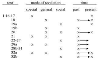 The whole of 1:18-32 may be put together as follows. In the present time, special revelation in the gospel declares the righteousness of God, the sinfulness of people, and the means of reconciling them to God (1:16-17). Whereas special revelation always reveals God’s righteousness,6 general revelation reveals especially God’s power and that continuously (1:20). Social revelation7 reveals particularly God’s displeasure (1:18).8 The manifest knowledge of God among people even in its perverted form witnesses to an original disclosure of God’s nature in special revelation. General revelation in nature has surrounded people with confirmatory evidence that should have kept them from turning aside to less adequate views of God than they originally had (1:19-20). So, knowing God from special revelation conformable to general revelation, people had no excuse for their apostasy and so God gave them up. The following diagram summarizes the description.9