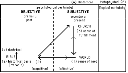 The schematic pictures a pattern distinct from that of other causal series like straight-line causation or thesis-antithesis-synthesis. Reciprocation involves two or more “poles” that operate back and forth on each other. So, the process can start with any of three positions in the “apologetic triangle,” and it can run backwards or forwards. Out of that pattern comes the growth potential that by degrees approaches certain crisis occasions like initial conversion, commitment to “specialized vocational ministry,” or the conquest of some besetting sin. The “degrees” here are degrees of the same thing in sanctification: greater and greater conviction, commitment, and correction in regard to Christ and his value system. Reciprocation gives increased power through inter-operation and growth potential through degrees.